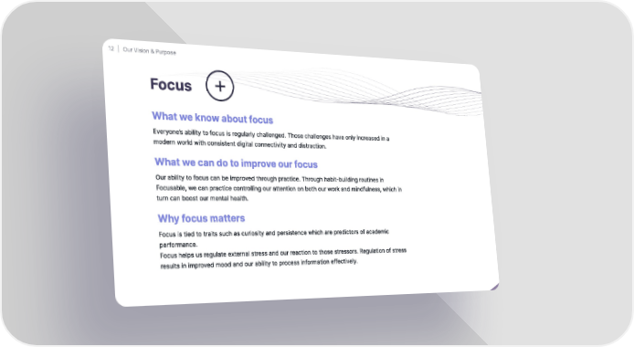 12 ⏐ Our Vision & Purpose Focus What weknowabout focus Everyone’s ability to focus is regularly challenged. Those challenges have only increased in a modern world with consistent digital connectivity and distraction. What we can do to improve our focus Our ability to focus can be improved through practice. Through habit-building routines in Focusable, we can practice controlling our attention on both our work and mindfulness, which in turn can boost our mental health. Why focus matters Focus is tied to traits such as curiosity and persistence which are predictors of academic performance⸀ Focus helps us regulate external stress and our reaction to those stressors. Regulation of stress results in improved mood and our ability to process information effectively.