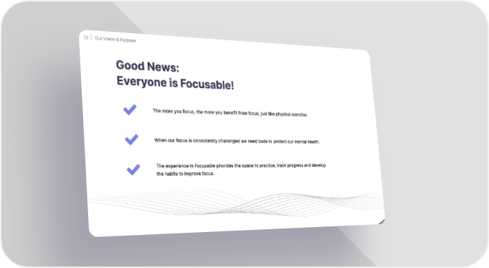 13 ⏐ Our Vision & Purpose GoodNews㨀 EveryoneisFocusable! The more you focus, the more you benefit from focus, just like physical exercise. When our focus is consistently challenged we need tools to protect our mental health. The experience in Focusable provides the space to practice, track progress and develop the habits to improve focus.