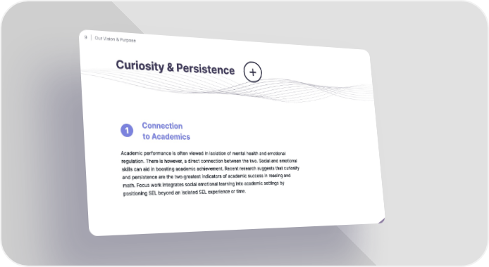 9 ⏐ Our Vision & Purpose Curiosity&Persistence Connectio渀 1 to Academics Academic performance is often viewed in isolation of mental health and emotional regulation. There is however, a direct connection between the two. Social and emotional skills can aid in boosting academic achievement. Recent research suggests that curiosity and persistence are the two greatest indicators of academic success in reading and math. Focus work integrates social emotional learning into academic settings by positioning SEL beyond an isolated SEL experience or time.