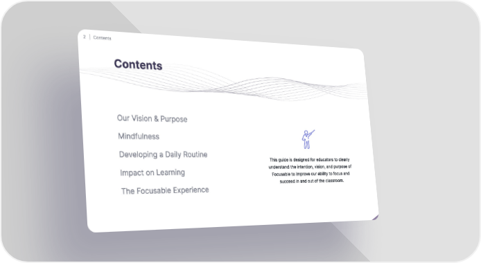 2 ⏐ Contents Contents Our Vision & Purpose Mindfulness Developing a Daily Routine This guide is designed for educators to clearly understand the intention, vision, and purpose of Impact on Learning Focusable to improve our ability to focus and succeed in and out of the classroom. The Focusable Experience