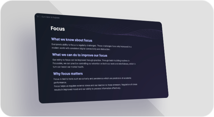 12 ⏐ Our Vision & Purpose Focus What we know about focus Everyone’s ability to focus is regularly challenged. Those challenges have only increased in a modern world with consistent digital connectivity and distraction. What we can do to improve our focus Our ability to focus can be improved through practice. Through habit-building routines in Focusable, we can practice controlling our attention on both our work and mindfulness, which in turn can boost our mental health. Why focus matters Focus is tied to traits such as curiosity and persistence which are predictors of academic performance⸀ Focus helps us regulate external stress and our reaction to those stressors. Regulation of stress results in improved mood and our ability to process information effectively.