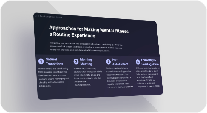 21 ⏐ Developing a Daily Routine Approaches for Making Mental Fitnes猀 a Routine Experience Integrating new experiences into a classroom schedule can be challenging. These four approaches look to ease the burden of adopting a new experience and find moments where rest and focus work with Focusable fit into existing structures. Natura氀 Mornin最 Preⴀ End of Day ☀ 2 3 4 1 Transitions Meeting Assessment Heading Home When students are transitioning In elementary classrooms, Students can benefit from a Giving the brain time to recharge from recess or lunch back into educators can incorporate whole moment of recharging prior to a at the end of the day or lesson the classroom, educators can group take mindful breaks and classroom assessment. Have helps students make sense of dedicate time to recharging and focus practice directly into their individual students complete a what they learned and charging with a Focusable pre-schedule搀 Focusable progression to experience. Consider an progression. morning meetings. regulate emotion and create Individual or whole class calmness in their body and mind. progression to wrap up the day.