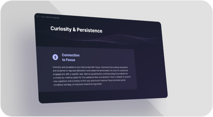 10 ⏐ Our Vision & Purpose Curiosity & Persistence Connectio渀 2 to Focus Curiosity and persistence are intertwined with focus. Improved focus allows educators and students to regulate distraction and create the environment to allow for sustained engagement with a specific task. Removing distraction and improving focus allows for curiosity by creating space for the sustained time and attention that is needed to explore new questions and curiosity. In this way practice to improve focus connects social emotional learning via improved emotional regulation.