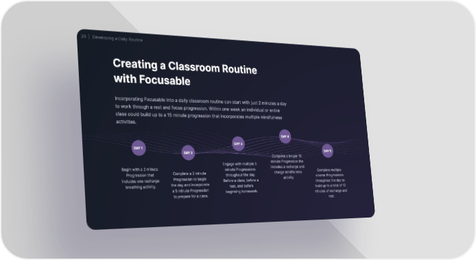 20 ⏐ Developing a Daily Routine Creating a Classroom Routin攀 with Focusable Incorporating Focusable into a daily classroom routine can start with just 2 minutes a day to work through a rest and focus progression. Within one week an individual or entire class could build up to a 15 minute progression that incorporates multiple mindfulness activities. day 4 day 3 day 1 day 5 day 2 Complete a longer 10 minute Progression the Engage with multiple 5 includes a recharge and Begin with a 2 minute minute Progressions Complete multiple charge mindfulness Complete a 2 minute Progression that throughout the day. shorter Progressions activity Progression to begin includes one recharge Before a class, before a throughout the day to the day and incorporate breathing activity. test, and before build up to a total of 12 a 5 minute Progression beginning homework. minutes of recharge and to prepare for a class. rest.