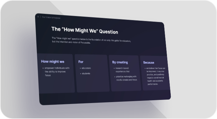 6 ⏐ Our Vision & Purpose The “How Might We” Question The “How might we” question below is the foundation of not only this guide for educators, but the intention and vision of Focusable. How might we For By creating Because empower individuals with educator research-based we believe that focus can the ability to improve experiences tha be improved, it requires students focus practice, and positively prioritize recharging with impacts overall mental mindful breaks and focus. health and academic performance.