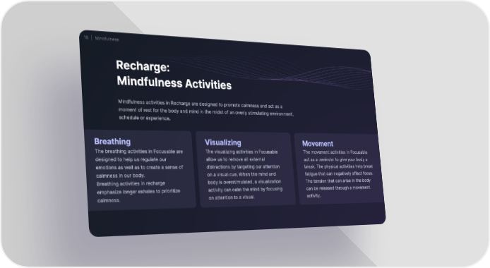 16 ⏐ Mindfulness Recharge㨀 Mindfulness Activities Mindfulness activities in Recharge are designed to promote calmness and act as a moment of rest for the body and mind in the midst of an overly stimulating environment, schedule or experience. Breathing Visualizing Movement The breathing activities in Focusable are The visualizing activities in Focusable The movement activities in Focusable designed to help us regulate our allow us to remove all external act as a reminder to give your body a emotions as well as to create a sense of distractions by targeting our attention break. The physical activities help break calmness in our body⸀ on a visual cue. When the mind and fatigue that can negatively affect focus. Breathing activities in recharge body is overstimulated, a visualization The tension that can arise in the body emphasize longer exhales to prioritize activity can calm the mind by focusing can be released through a movement calmness. on attention to a visual. activity.